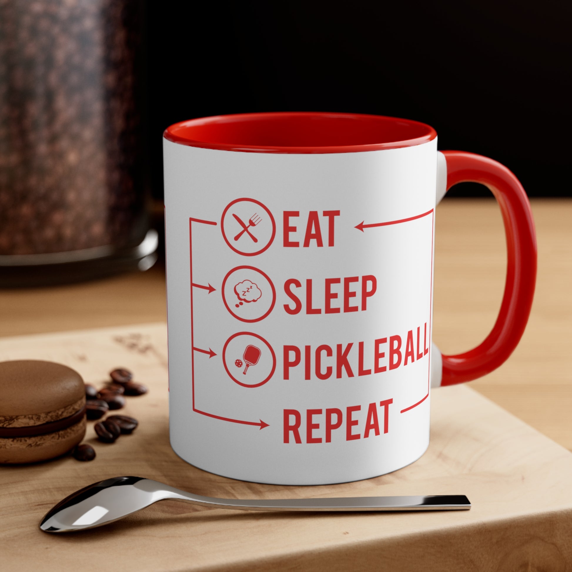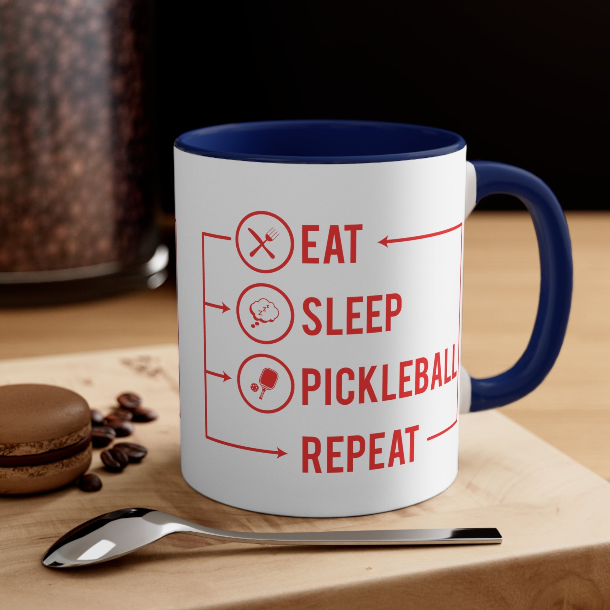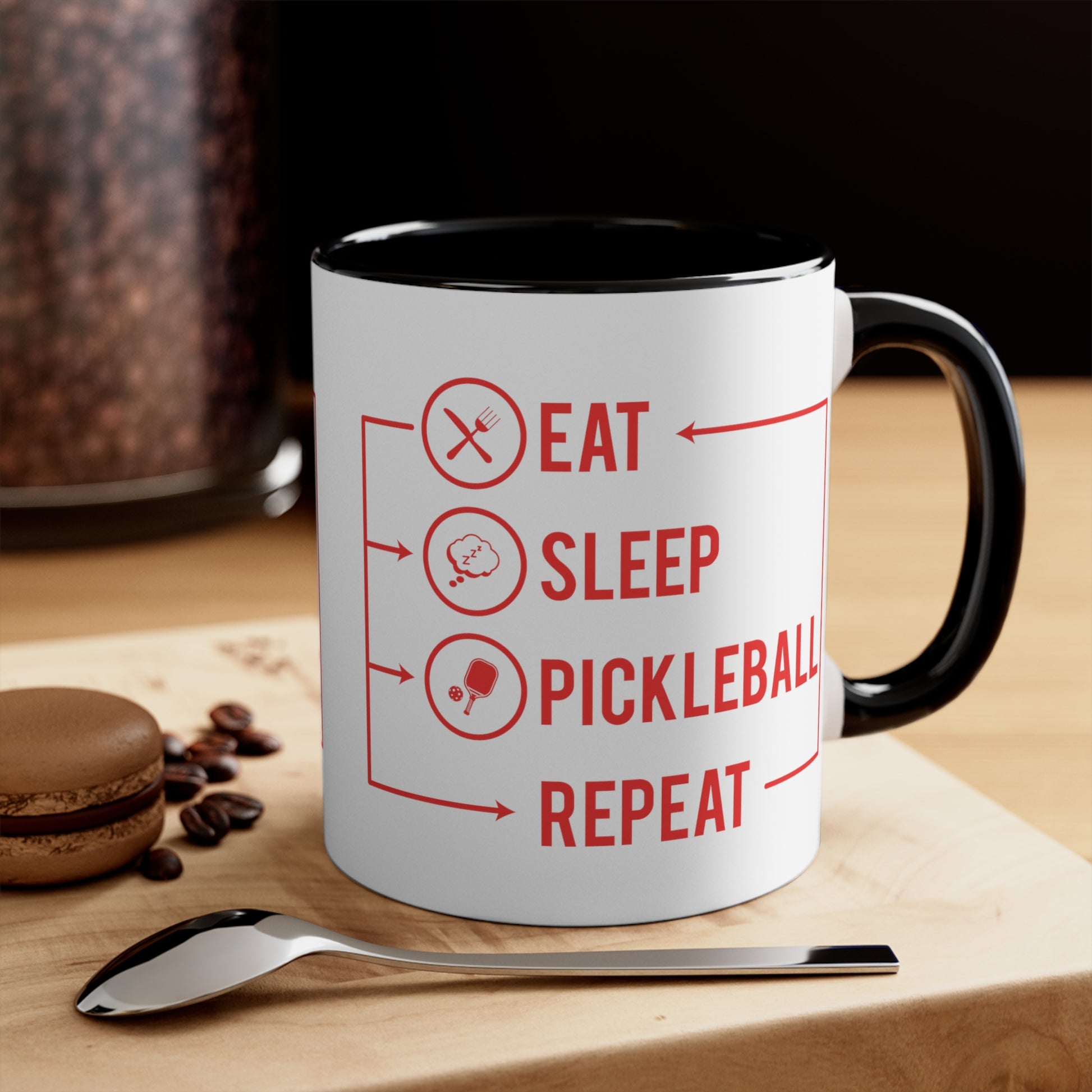 11oz "Eat Sleep Pickleball Repeat" Coffee Mug, designed for the passionate pickleball enthusiast who knows how to balance play and relaxation. With its rounded corners and comfortable grip, this mug provides a pleasurable drinking experience, allowing you to savor every sip of your favorite beverage.