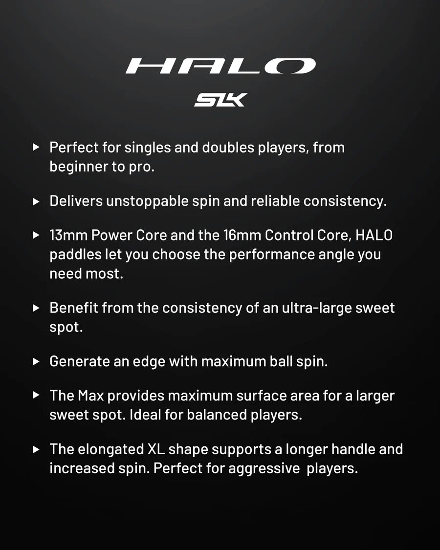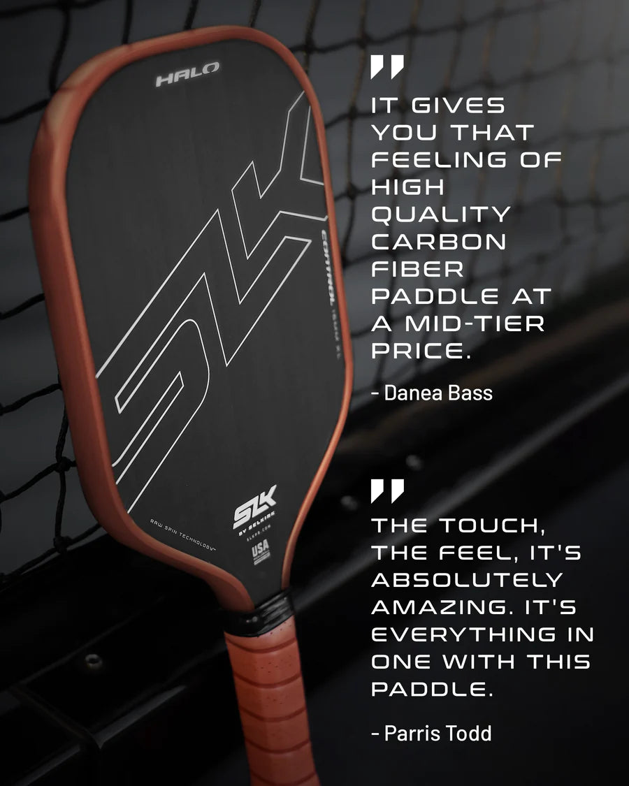 The Halo line of paddles with T700 Raw Carbon is the paddle of choice for beginner to Pro level Pickleball players alike, who are looking for optimal spin and control in their paddle.